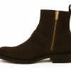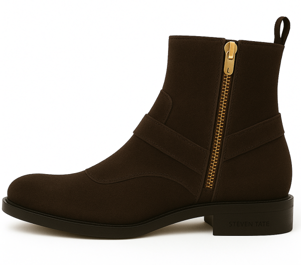 This image showcases a Steven Tate signature ankle boot crafted in espresso brown suede—a rich, deep tone that exudes quiet luxury and timeless masculinity. It’s a perfect fusion of tailored elegance and subtle western influence, amplified by gold detailing and a flawless suede finish.
