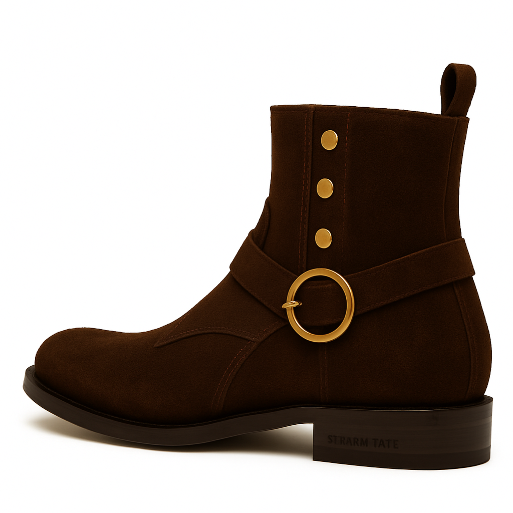 This image showcases a Steven Tate signature ankle boot crafted in espresso brown suede—a rich, deep tone that exudes quiet luxury and timeless masculinity. It’s a perfect fusion of tailored elegance and subtle western influence, amplified by gold detailing and a flawless suede finish.