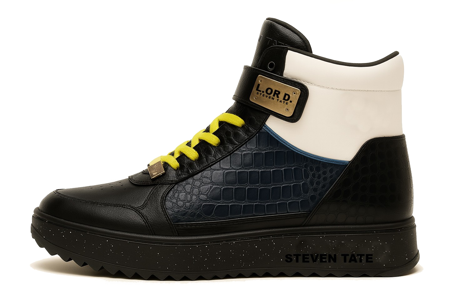 Elevate your sneaker game with the Tricolor Croc Edition from L.OR D. by Steven Tate—a masterclass in bold craftsmanship and elevated streetwear design. This high-top sneaker blends classic style with powerful contrasts and luxury detail for the modern visionary.