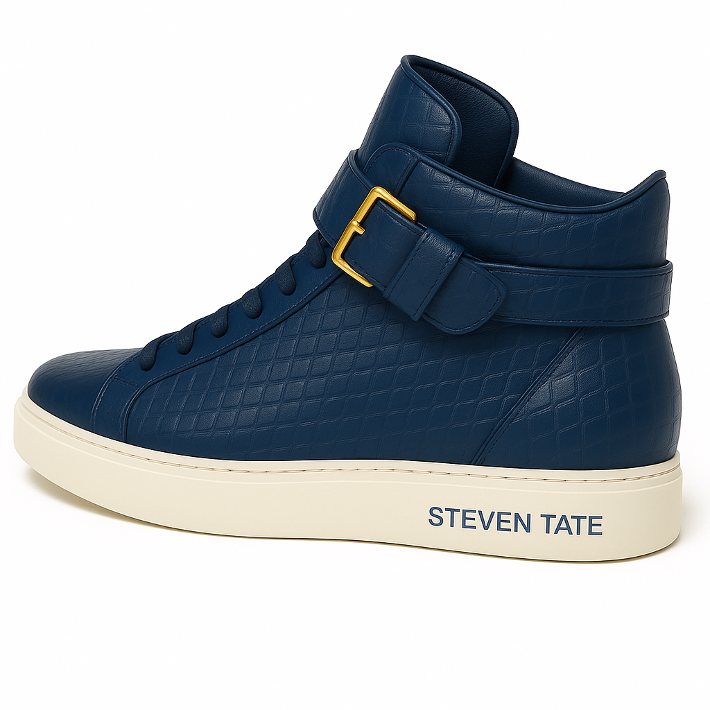 This premium high-top sneaker from STEVEN TATE embodies luxury craftsmanship and bold elegance. Wrapped in rich navy-blue croc-embossed leather, the upper exudes a refined exotic texture that adds depth and distinction to the silhouette.