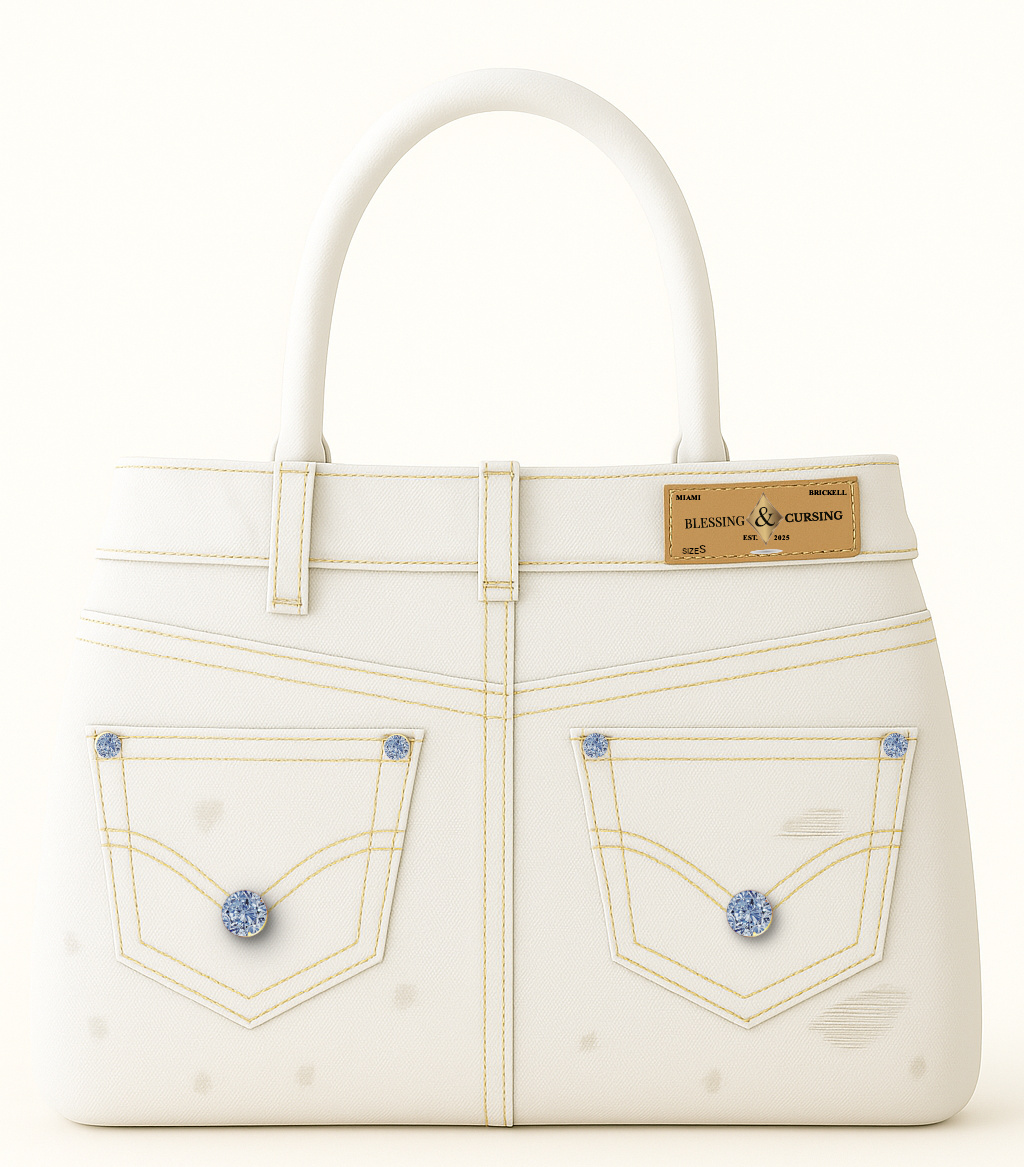 The Pure White Swarovski Denim Tote captures the essence of purity, refinement, and radiant luxury. The stark white denim paired with sparkling Swarovski crystals symbolizes light and prestige, balancing Blessing & Cursing’s dual ethos of rebellious streetwear roots with haute couture craftsmanship. Designed for collectors and high-fashion enthusiasts who demand exclusivity and elegance.