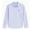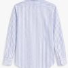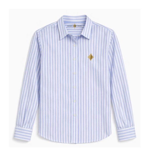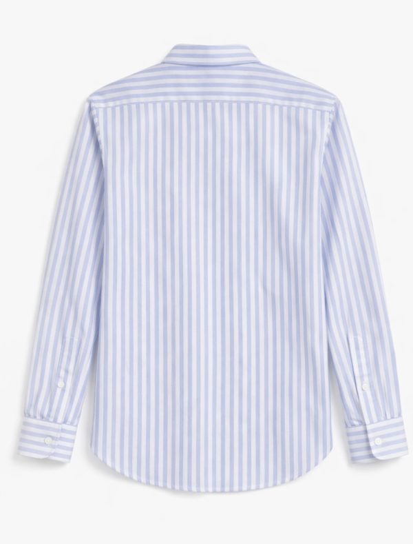 A refined, tailored button-down shirt in soft powder blue and white vertical pinstripes. The silhouette is structured but modern — fitted through the torso with a clean shoulder line and balanced sleeve taper.