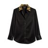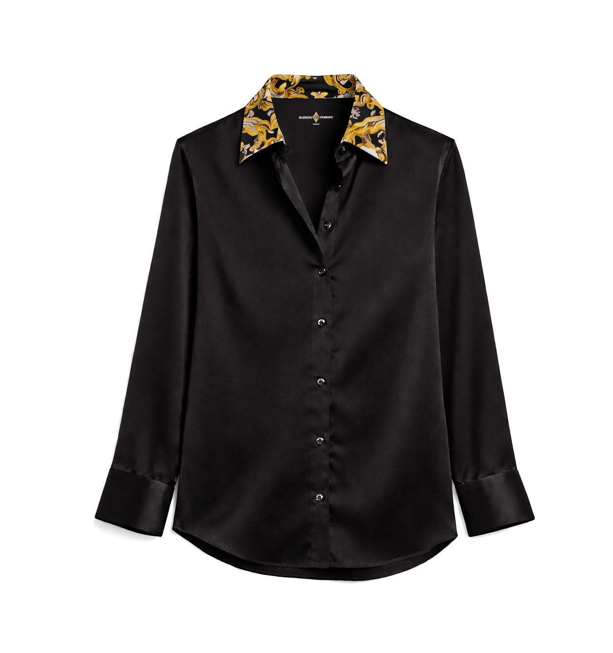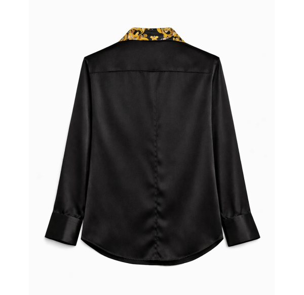 The silhouette is clean and precise, featuring a classic button-down front, tailored long sleeves, and a softly curved hem for fluid drape and flattering structure. The defining accent is the gold baroque interior collar lining, which subtly reveals itself when worn open — a restrained touch of opulence against the pure black base.