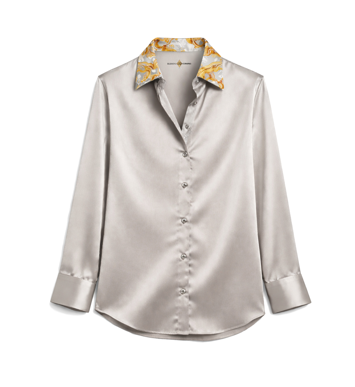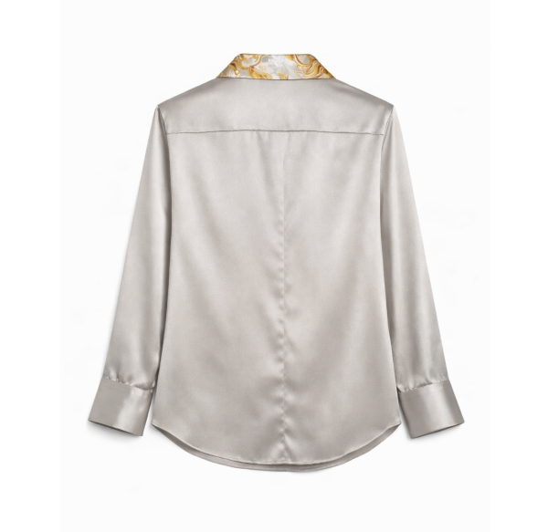 Crafted from premium silk-touch satin, this blouse drapes fluidly over the body with a smooth, weightless feel. The classic button-down silhouette is elevated by a delicate gold baroque interior collar lining, offering a refined flash of ornamentation when the collar is worn open — a quiet detail reserved for those who notice craftsmanship.