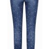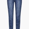 Crafted from premium stretch Italian denim, this silhouette hugs the waist, hips, and legs with a precise skinny fit that elongates the figure and creates a sleek, feminine line. The deep indigo wash is finished with a soft vintage fade and hand-applied micro crystal dot detailing — creating a subtle starlight effect that catches light with every movement.