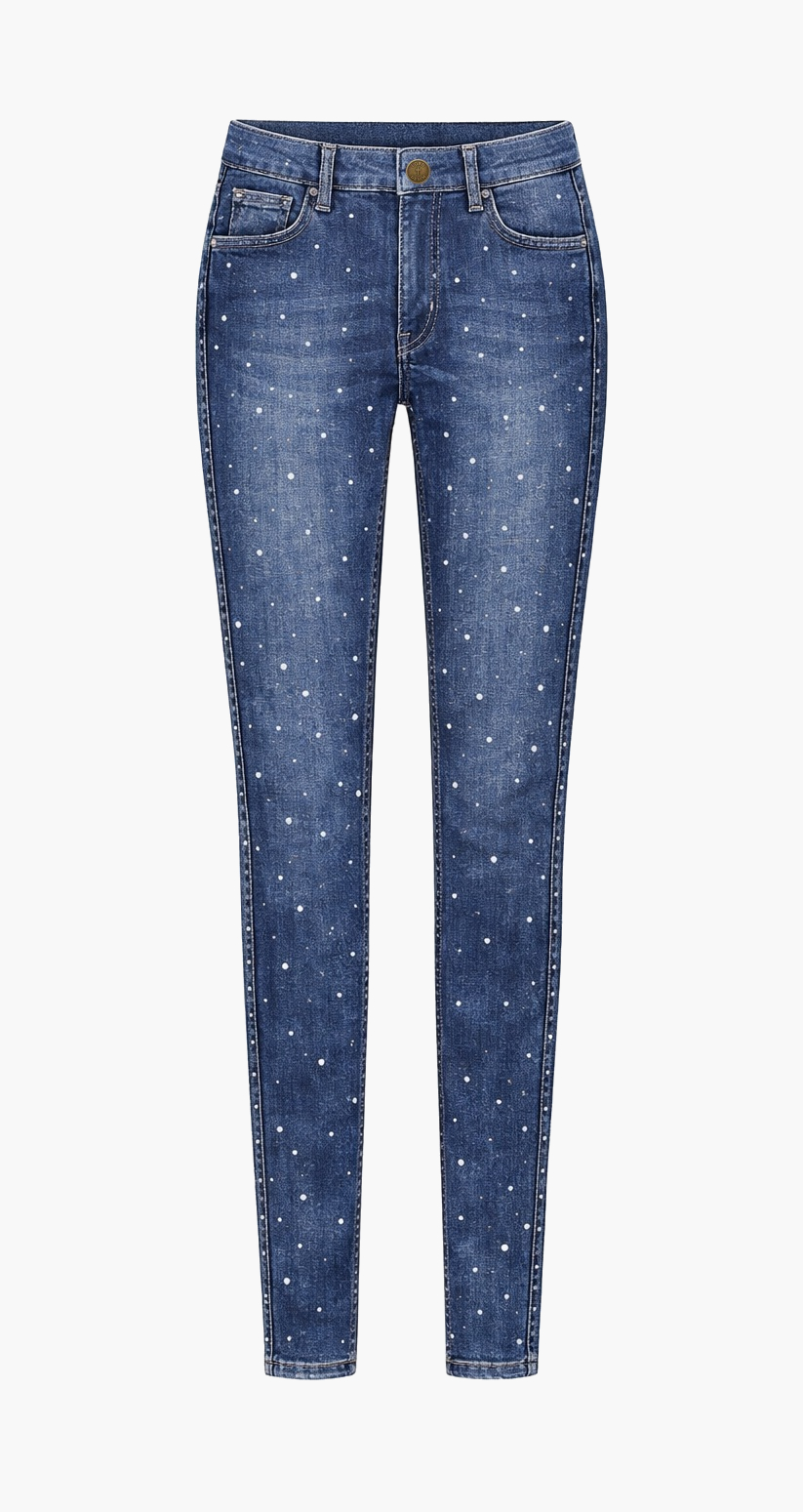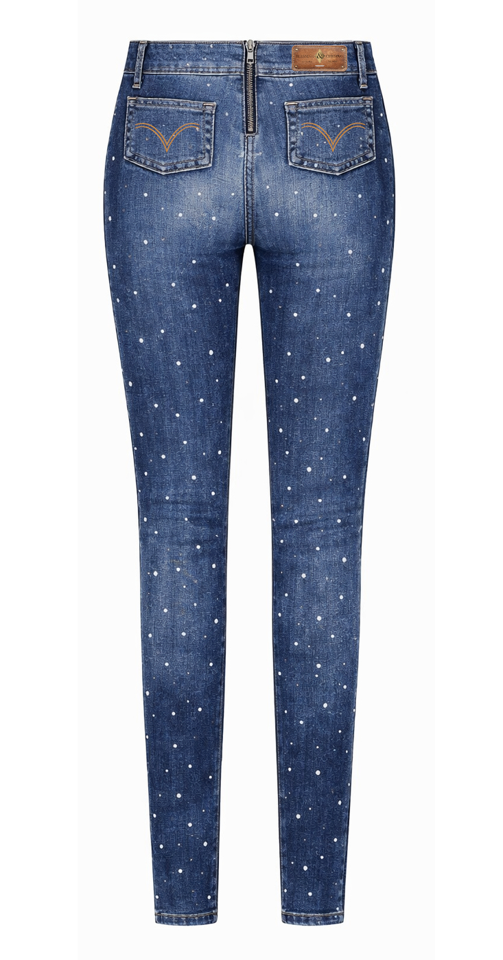 Crafted from premium stretch Italian denim, this silhouette hugs the waist, hips, and legs with a precise skinny fit that elongates the figure and creates a sleek, feminine line. The deep indigo wash is finished with a soft vintage fade and hand-applied micro crystal dot detailing — creating a subtle starlight effect that catches light with every movement.