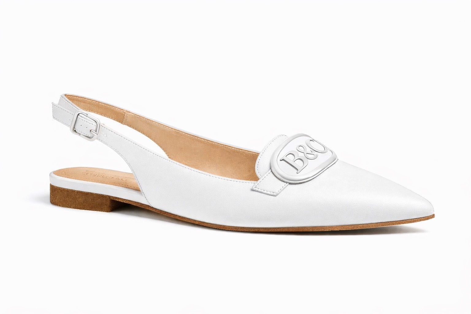 - Closure: Adjustable slingback strap with tonal white buckle
