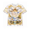 The Heaven’s Paradise White Edition is a refined, luminous expression of divine luxury and elevated street couture. Crafted on a pristine white satin-touch base, this piece showcases a breathtaking celestial composition framed in rich baroque gold ornamentation.