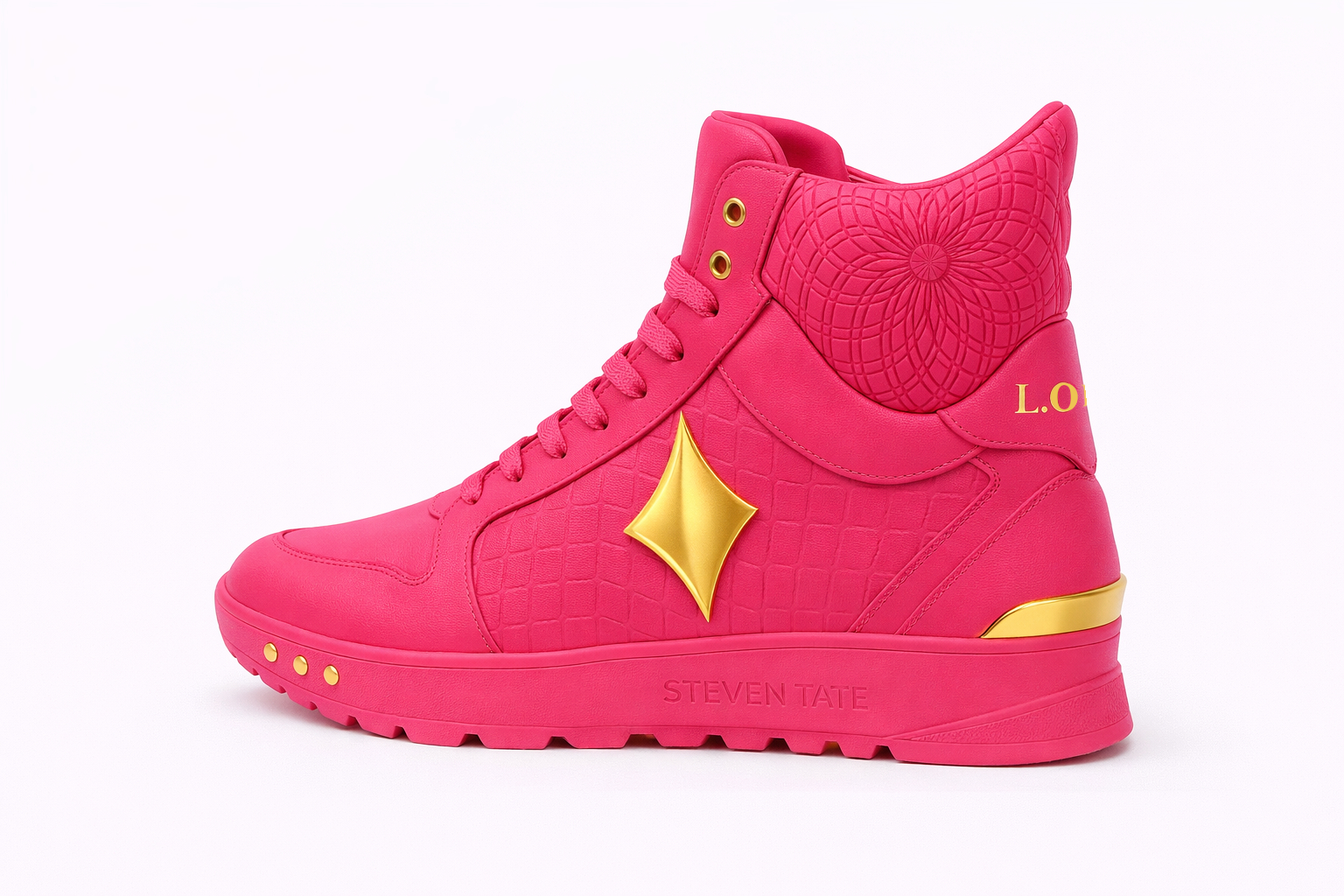 - Brand Signature: “STEVEN TATE” embossed into the midsole in tonal fuchsia for subtle, seamless branding.