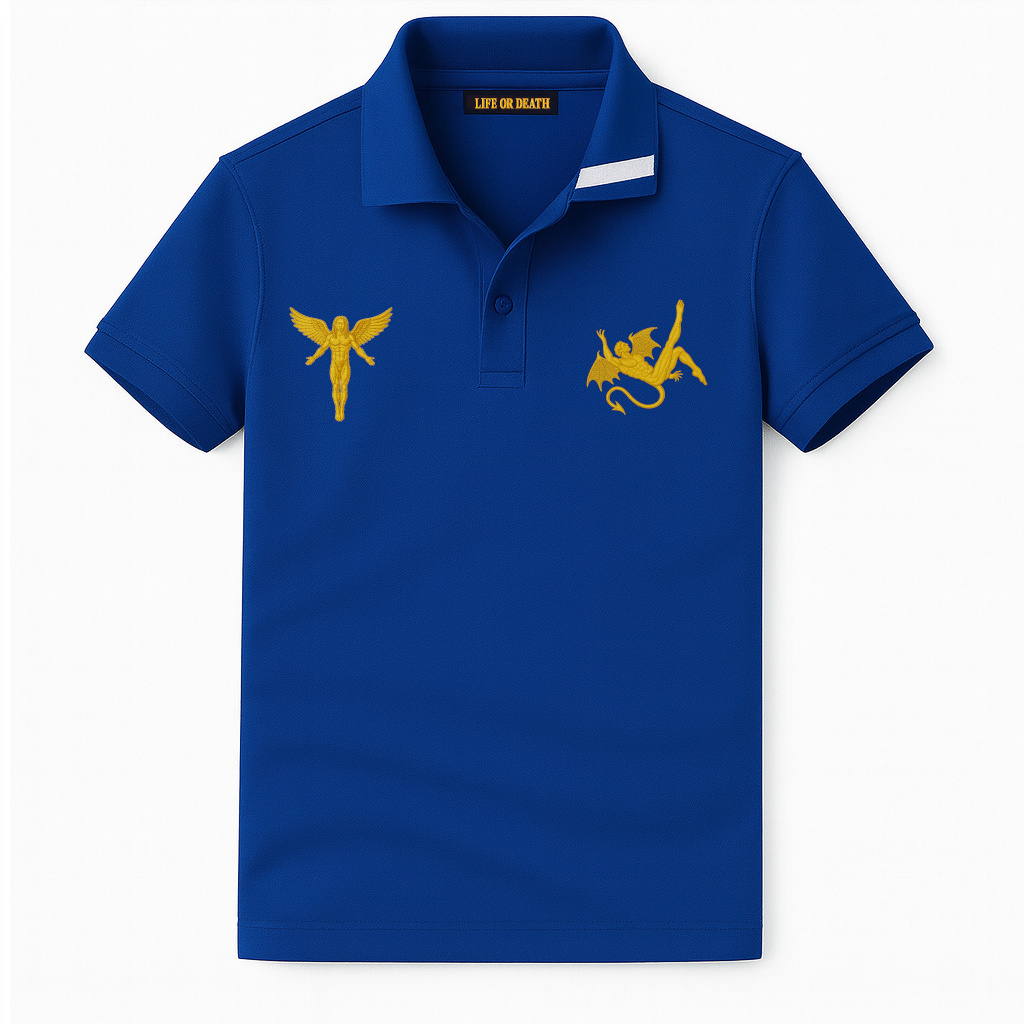 This polo fuses luxury fashion with symbolic storytelling. The angel and demon motifs embody the eternal balance of light vs. darkness, good vs. evil, life vs. death – the foundation of the LIFE OR DEATH brand identity.