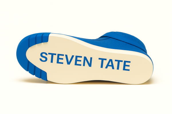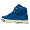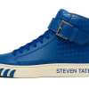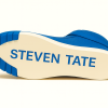 A defining feature is the wide leather ankle strap, secured by a blue buckle, adding a distinct designer touch while enhancing ankle support. The sneaker is grounded on a thick, off-white rubber midsole, contrasted beautifully by deep blue claw-like graphics wrapping the front and outer sole — a bold signature aesthetic. On the lateral side, “STEVEN TATE” is cleanly printed in a sharp sans-serif blue font, standing out with refined authority.