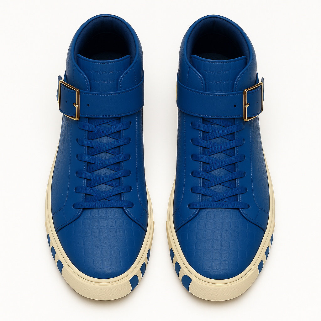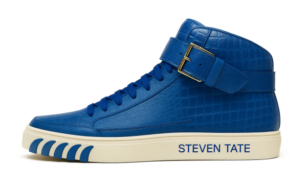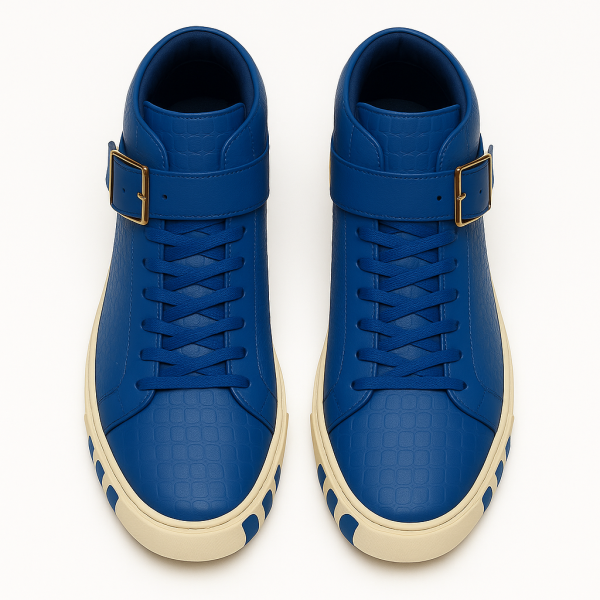 Command attention with the STEVEN TATE high-top sneaker — a bold fusion of high fashion and streetwise edge. This premium silhouette is crafted from blue crocodile-embossed Italian leather, offering an exotic, tactile finish that radiates luxury from every angle. The croc texture flows seamlessly across the upper, from the sharply structured toe box to the padded ankle collar, delivering an elevated and rugged appeal.