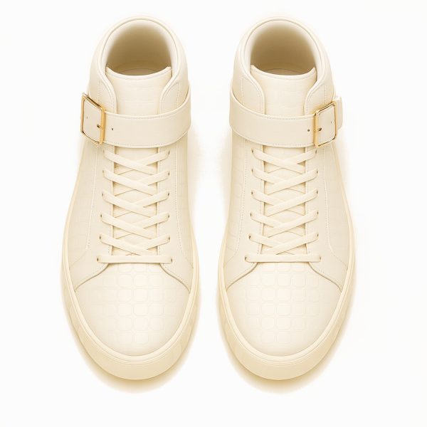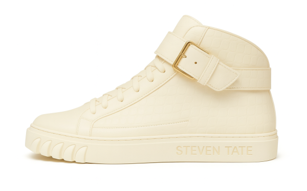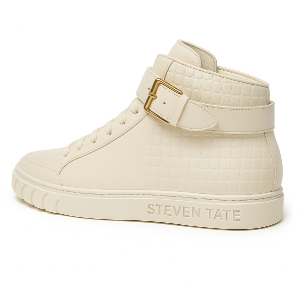 Command attention with the STEVEN TATE high-top sneaker — a bold fusion of high fashion and streetwise edge. This premium silhouette is crafted from cream crocodile-embossed Italian leather, offering an exotic, tactile finish that radiates luxury from every angle. The croc texture flows seamlessly across the upper, from the sharply structured toe box to the padded ankle collar, delivering an elevated and rugged appeal.