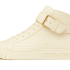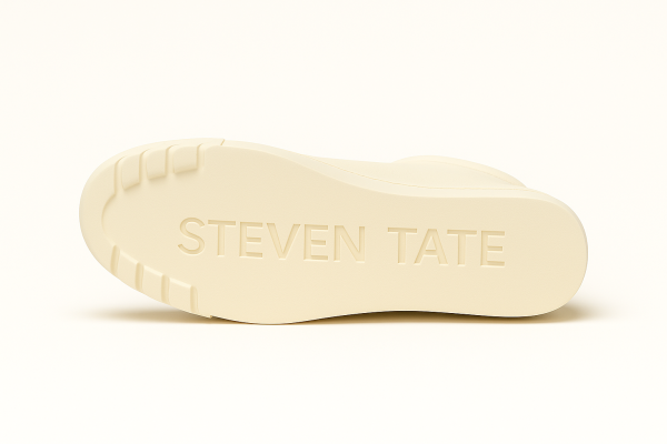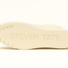 A defining feature is the wide leather ankle strap, secured by a cream buckle, adding a distinct designer touch while enhancing ankle support. The sneaker is grounded on a thick, off-white rubber midsole, contrasted beautifully by cream claw-like graphics wrapping the front and outer sole — a bold signature aesthetic. On the lateral side, “STEVEN TATE” is cleanly printed in a sharp sans-serif cream font, standing out with refined authority.