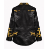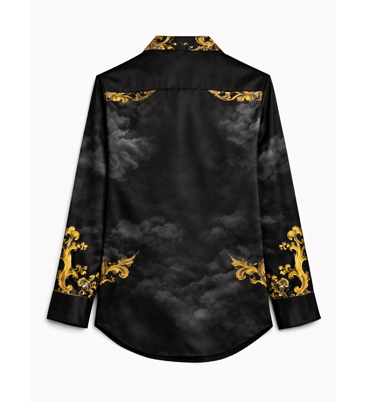 The back is dramatic and moody, featuring a deep black cloudscape with subtle tonal gradients, giving the garment a cinematic, atmospheric presence. Gold baroque accents on the collar, cuffs, and upper back yoke elevate the shirt into the realm of wearable art.