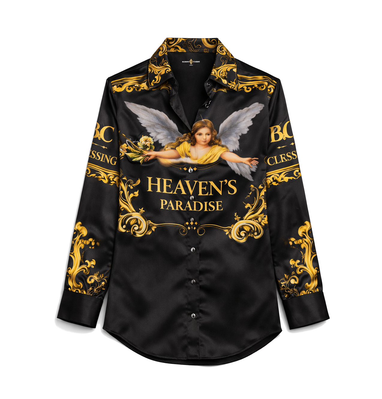 The B&C Heaven’s Paradise Satin Shirt is a bold expression of luxury, faith, and duality — blending celestial beauty with dark elegance. Crafted from a high-sheen, silk-touch satin, the shirt delivers a smooth, fluid drape with a rich, polished finish that feels as elevated as it looks.
