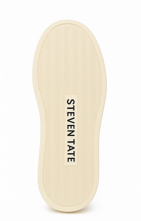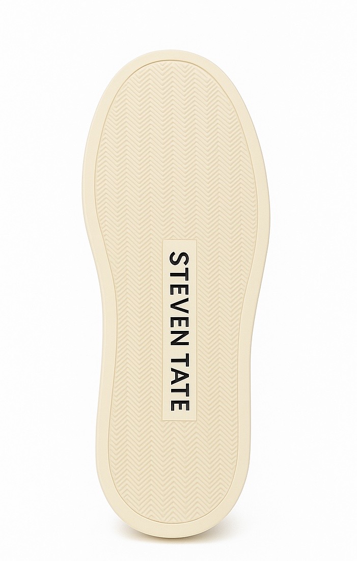 The sneaker is anchored by a clean, cream-colored rubber outsole, providing contrast and comfort without compromising on elegance. The midsole features subtle STEVEN TATE branding engraved, reinforcing its designer exclusivity.