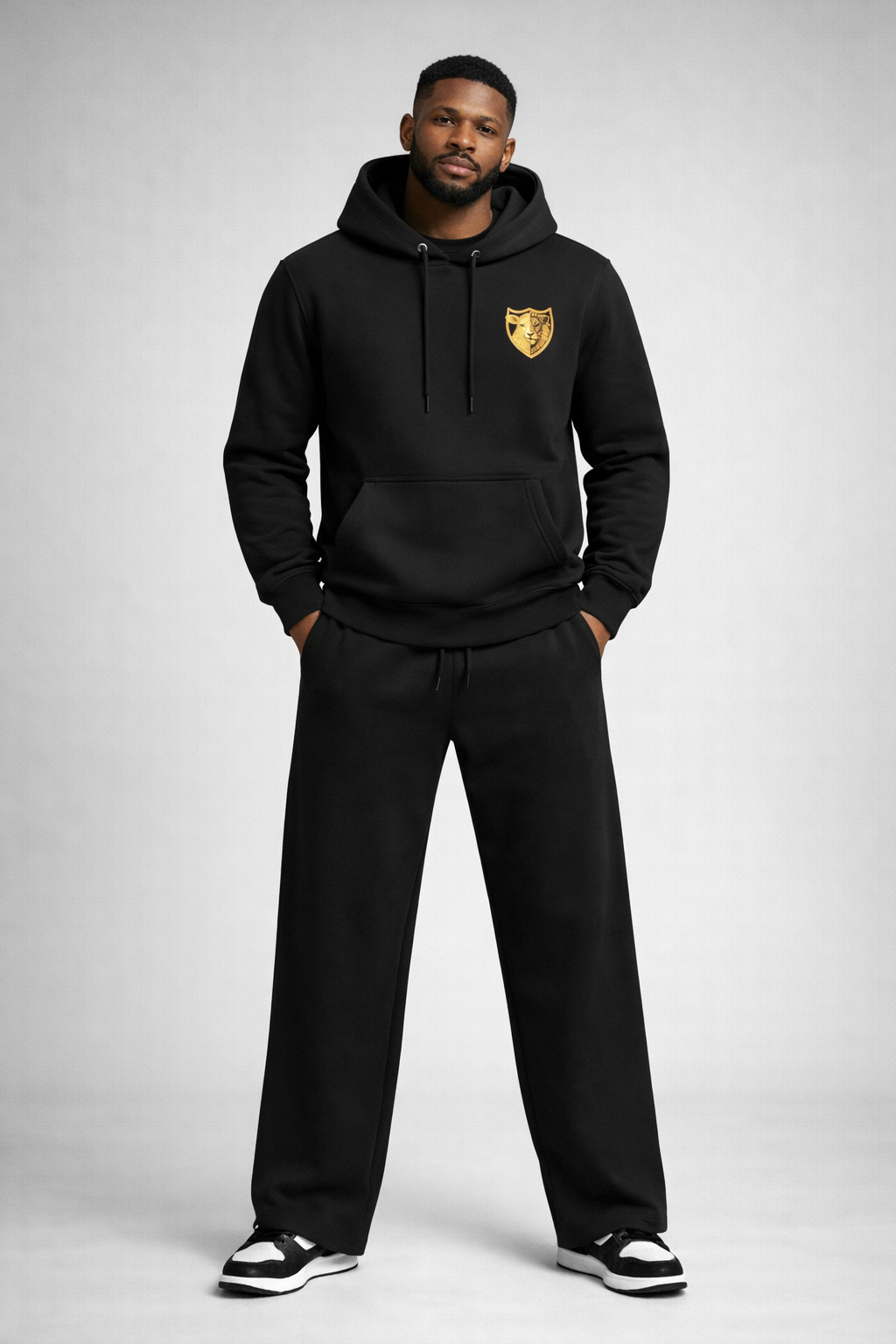 This all-black Steven Tate luxury sweatsuit set delivers a bold, authoritative silhouette while maintaining refined elegance. The pairing juxtaposes subtle power with high symbolism: the matte-black embossed STEVEN TATE lettering on the pants creates a stealth-luxury identity, while the hoodie features the striking Lion & Lamb gold crest—a signature emblem representing strength, humility, and duality.