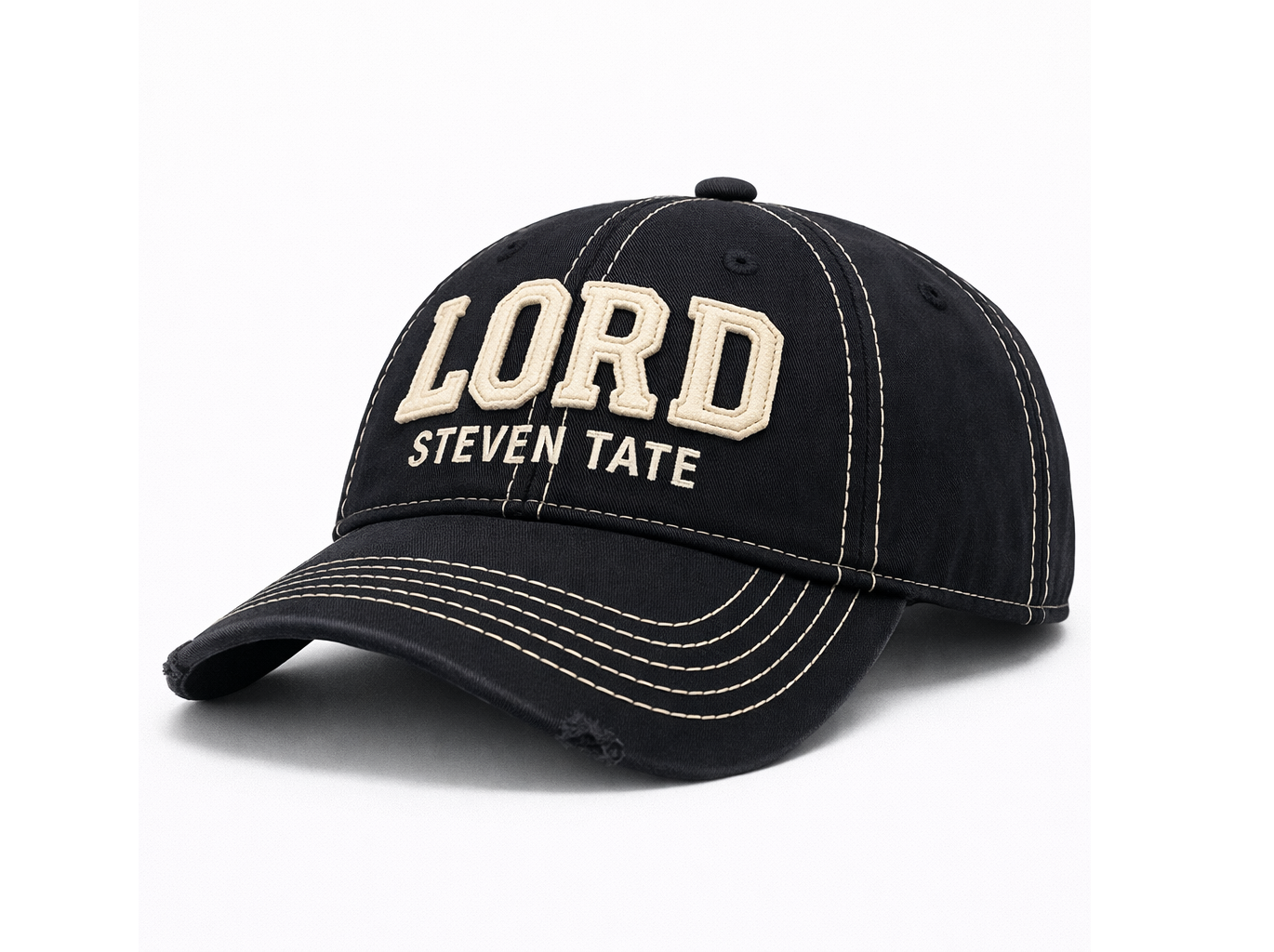 The front showcases the iconic LORD embroidery in raised varsity-style stitching, with STEVEN TATE precisely embroidered underneath — creating a bold yet elegant brand presence. Contrast stitching along the panels and brim highlights the construction lines and enhances the handcrafted look.