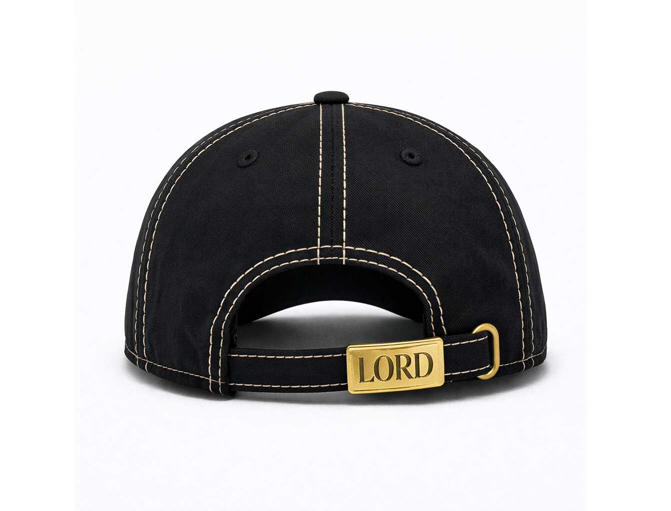 The back features a custom engraved metal buckle with LORD branding, plated in brushed gold for a refined accent, paired with a matching fabric strap for adjustable comfort.
