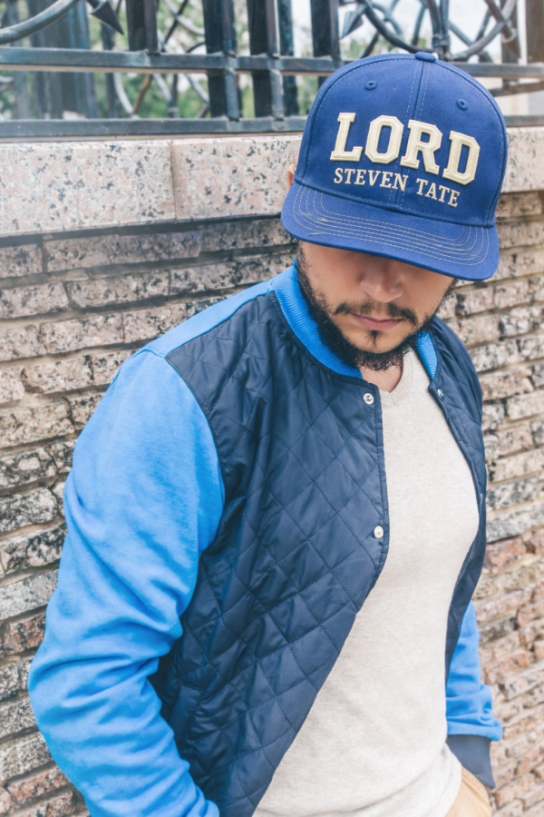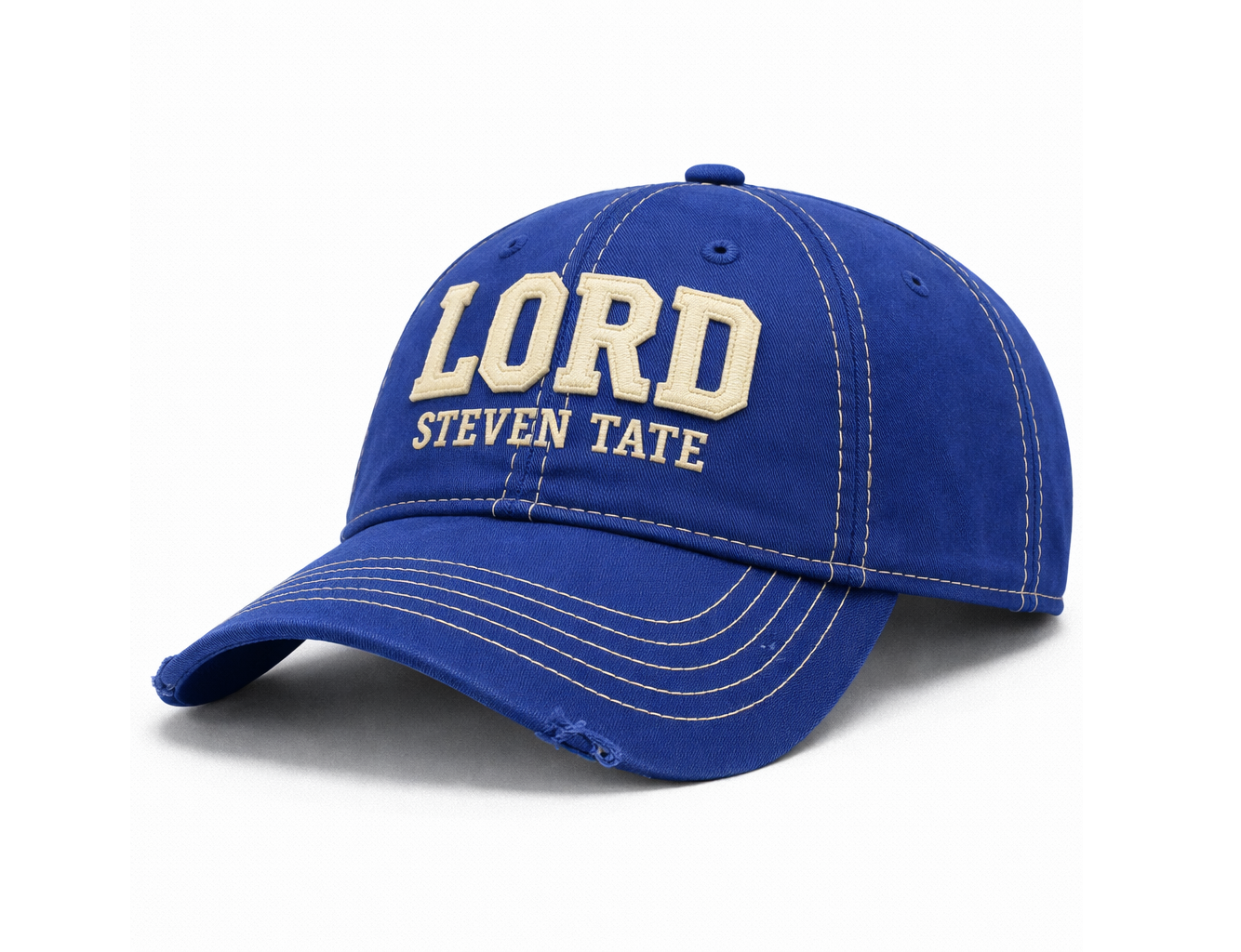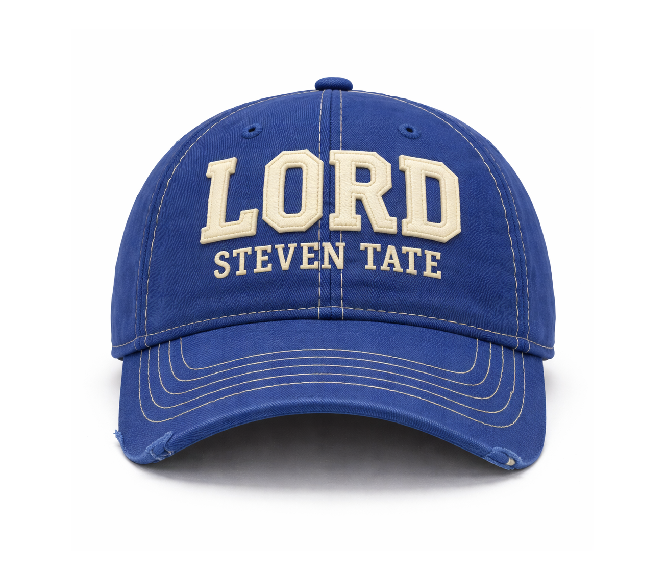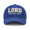 The front is finished with premium raised embroidery spelling LORD in warm ivory thread, with STEVEN TATE stitched beneath in a smaller matching tone. The embroidery sits centered across the front panels, giving the cap a strong, confident presence without overpowering the design.