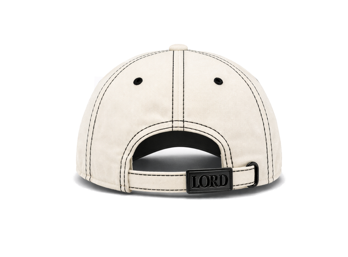 The brim is gently curved with multi-row contrast stitching and subtle distressed edge details for a worn-in, heritage feel. The back features a premium matte black metal adjustable clasp, engraved with LORD, offering both functionality and a signature luxury touch.
