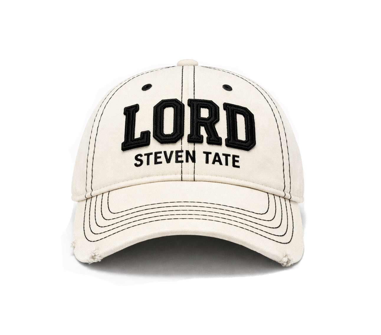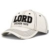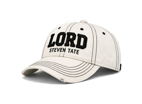 The cap features a structured six-panel crown in a warm off-white / cream tone, accented with black contrast stitching throughout the panels and brim for a bold, graphic finish. The front is finished with raised, high-density embroidery reading LORD in bold collegiate lettering, with STEVEN TATE stitched beneath in a refined smaller typeface — creating a strong brand presence without overpowering the design.