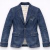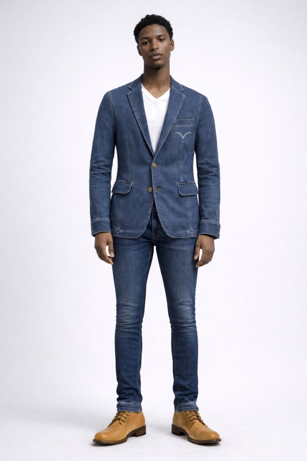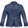 Crafted from high-quality structured blue denim, the blazer features precise paneling and contour seams that enhance the body’s natural shape. The single-breasted front with two metal buttons offers versatility—wear it fully buttoned for authority or slightly open for relaxed elegance.