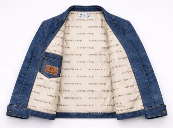 Inside, the blazer is fully lined with the official Steven Tate signature lining—a cream silk-blend fabric printed repeatedly with STEVEN TATE in refined brown lettering. This lining is exclusive to the brand and reinforces luxury identity the moment the jacket is opened.