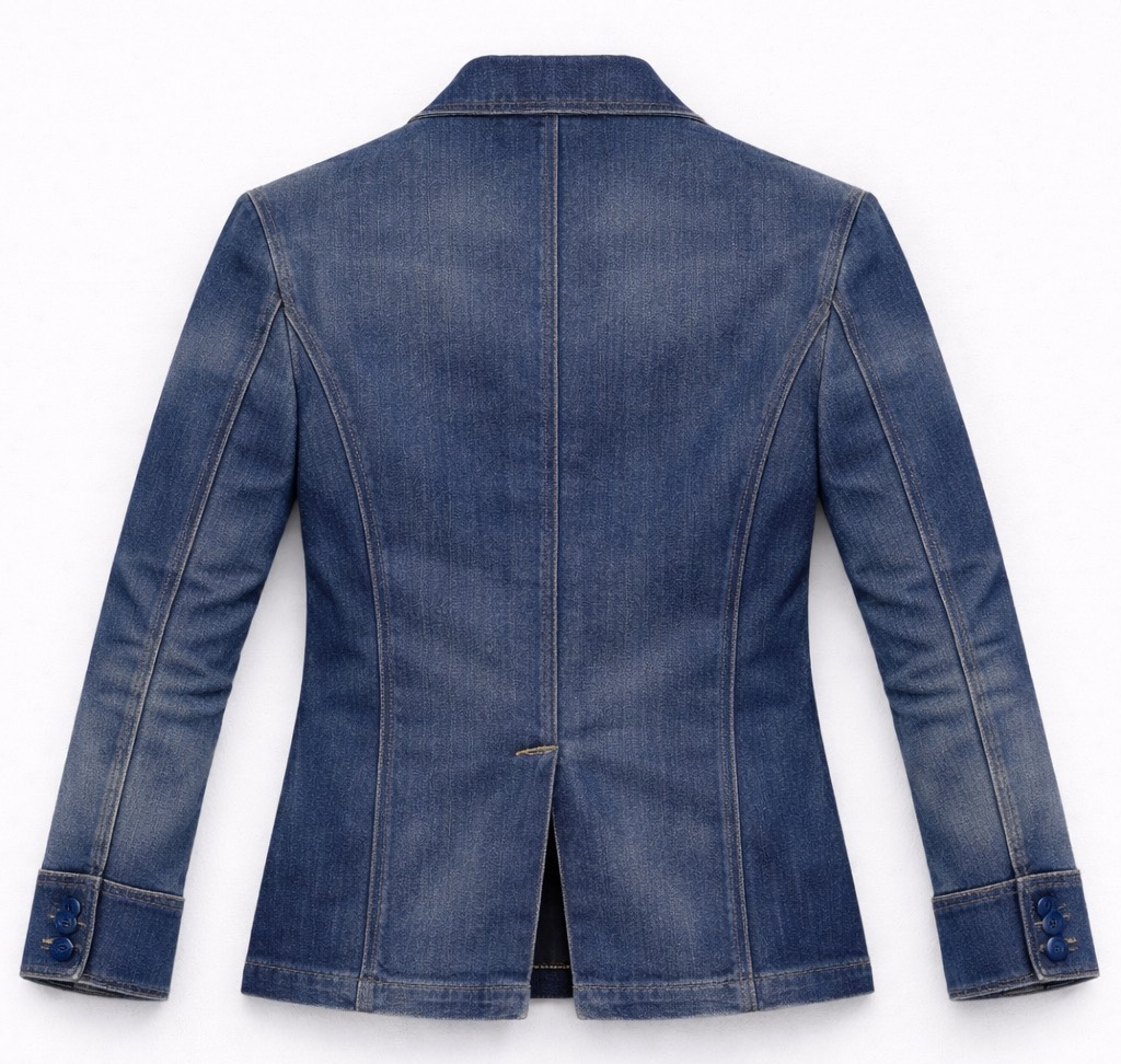 Crafted from high-quality structured blue denim, the blazer features precise paneling and contour seams that enhance the body’s natural shape. The single-breasted front with two metal buttons offers versatility—wear it fully buttoned for authority or slightly open for relaxed elegance.
