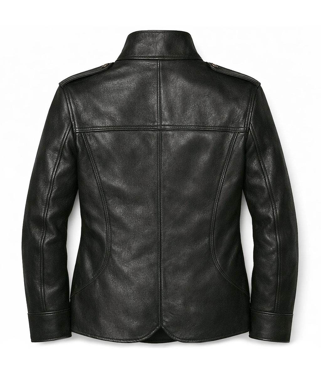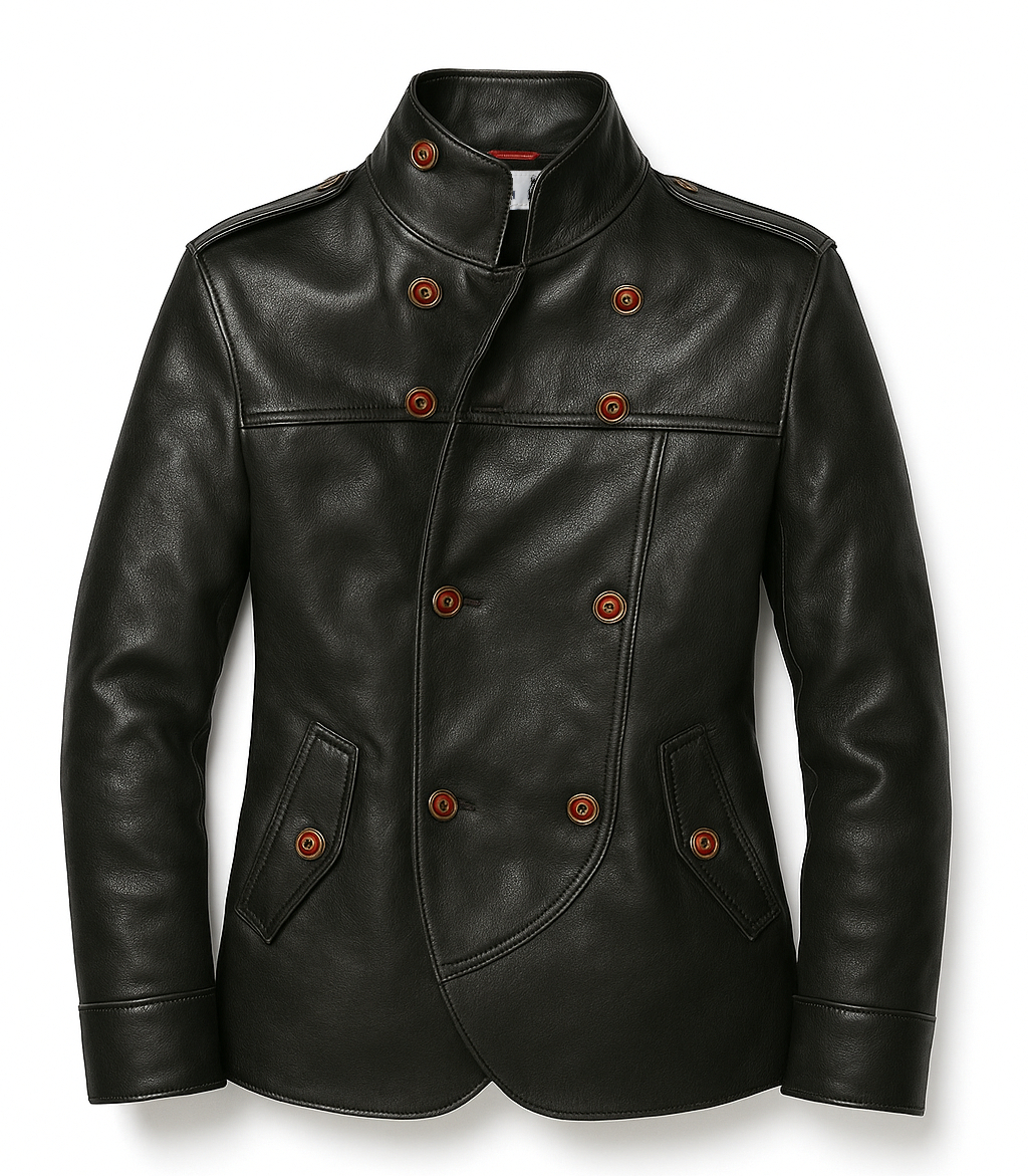 This jacket is a refined, military-inspired leather officer coat with a sharp, authoritative silhouette. The cut is structured and tailored, tapering subtly at the waist and finishing just below the hip, delivering a commanding yet elegant profile. It blends heritage uniform design with modern luxury minimalism.