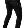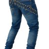 The highlight of this design is the hand-placed gold stud strap that diagonally wraps across the upper back panel, forming a stunning visual motion line that gives the jeans a couture, armor-inspired aesthetic. The strap is reinforced with heavy-duty stitching to ensure long-term durability while maintaining a polished, high-luxury appearance.