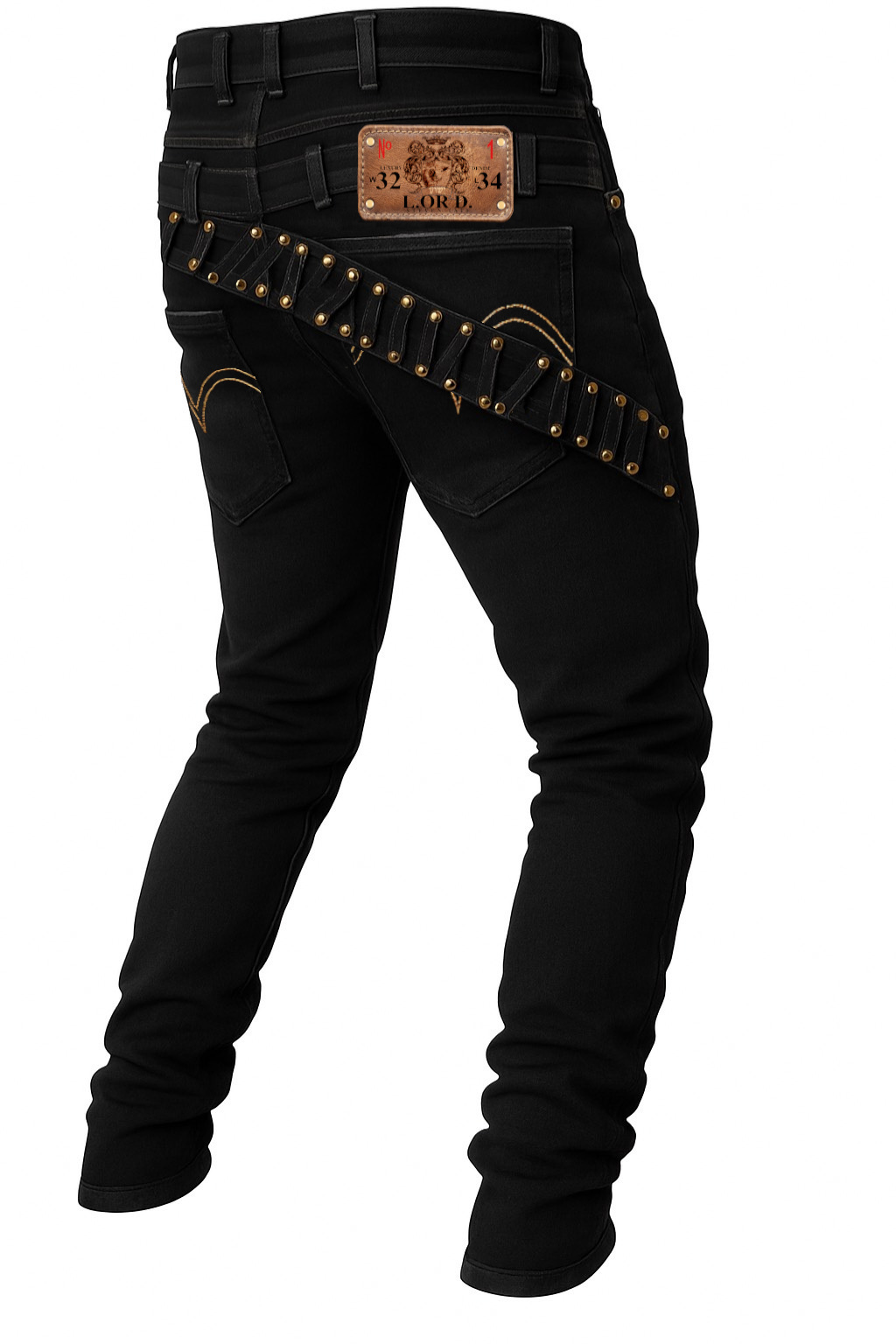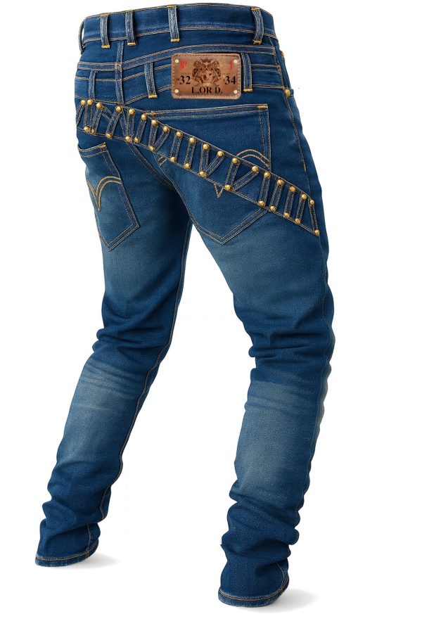 The LORD “Golden Strap Studded Denim” is a signature high-fashion statement piece that combines premium craftsmanship with bold luxury detailing. Made from 14oz deep-indigo stretch denim, these jeans are sculpted to enhance the natural leg line while providing comfort and mobility.