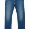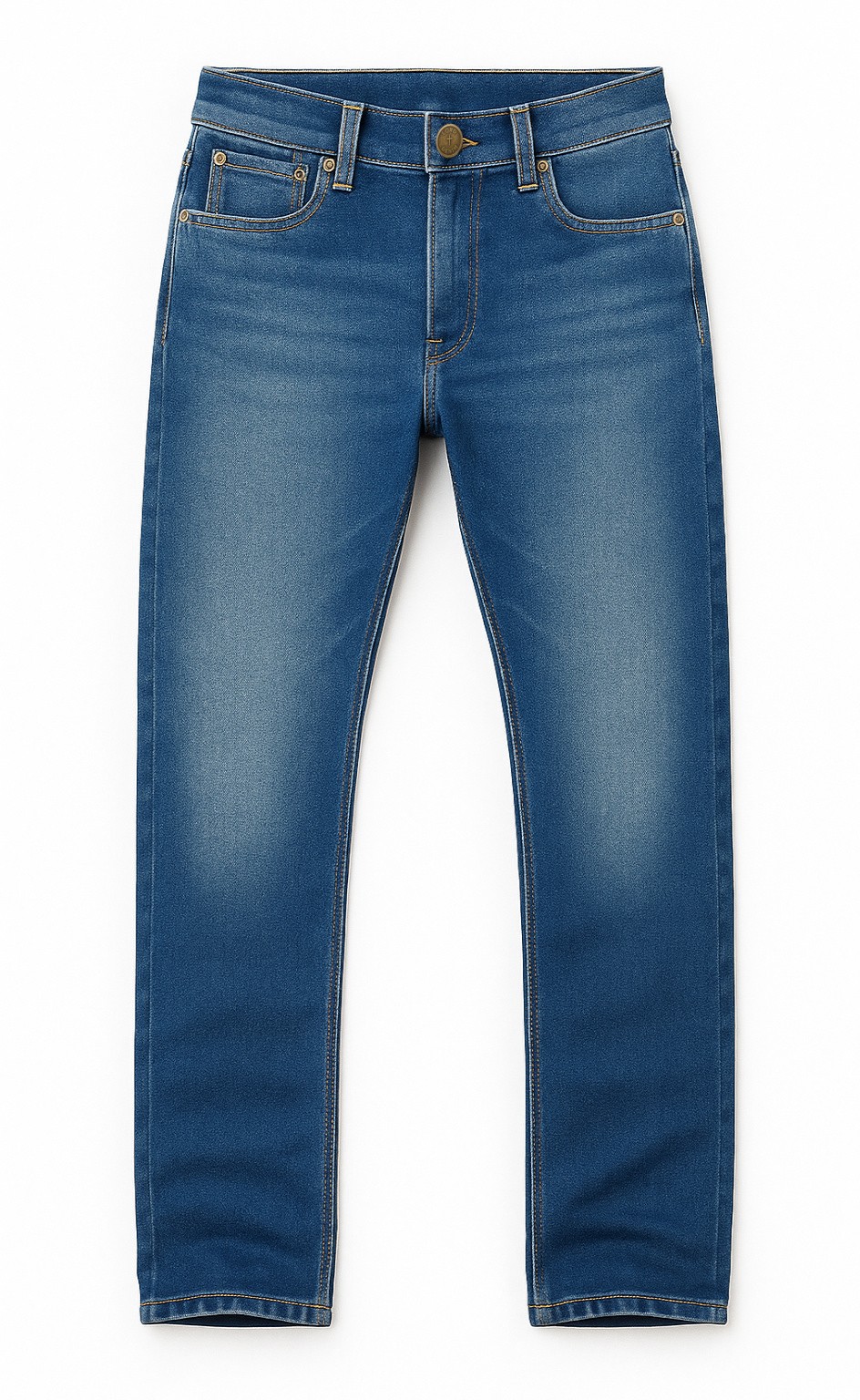 The wash blends light fading across the thighs and knees with a natural break-in pattern, reminiscent of raw denim evolution but softened for everyday wear. A straight-leg/modern tapered hybrid fit offers room at the thigh with a narrow profile through the calf and ankle—allowing for stacking or clean drops depending on styling preference.