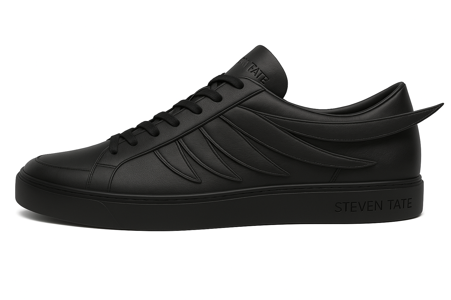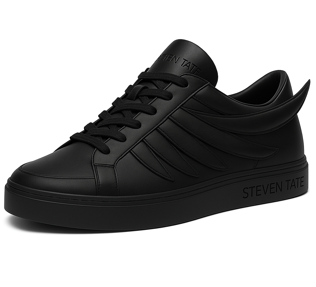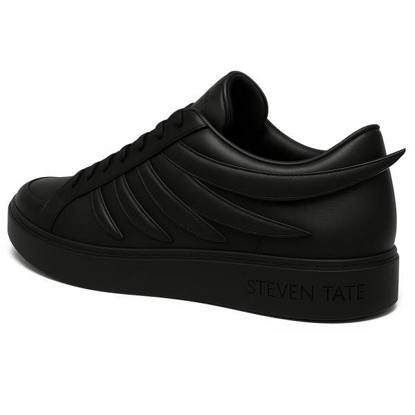 This sneaker is a premium low-top black-on-black winged sneaker from the STEVEN TATE collection, blending minimalist elegance with avant-garde sculptural design.