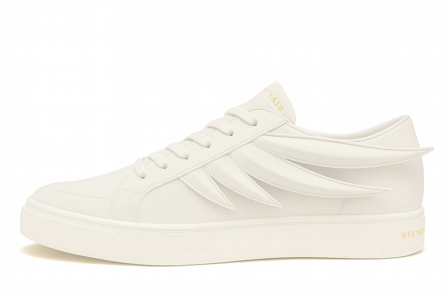 This sneaker is a premium low-top white-on-white winged sneaker from the STEVEN TATE collection, blending minimalist elegance with avant-garde sculptural design.