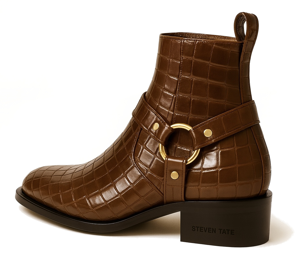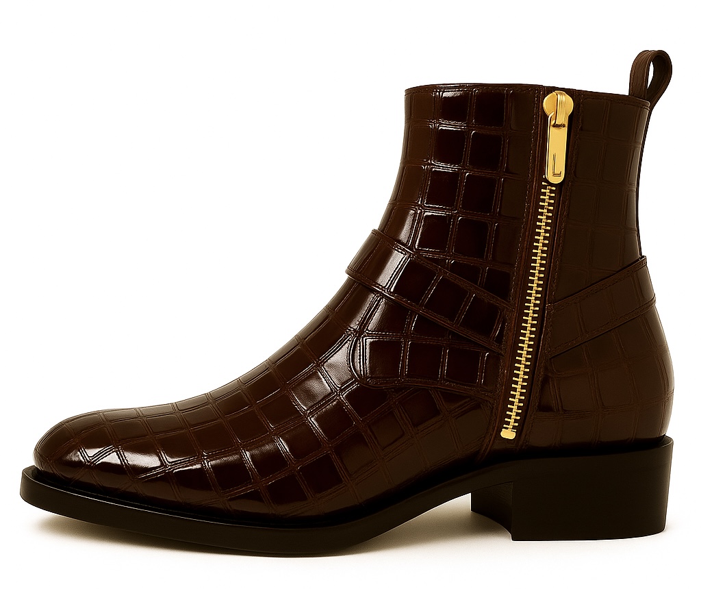 This boot is a refined reinterpretation of western-inspired harness footwear—modernized through a luxury lens. The rich brown crocodile-embossed leather delivers a distinguished presence, perfect for elevating both tailored and casual ensembles.