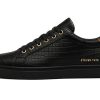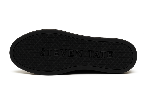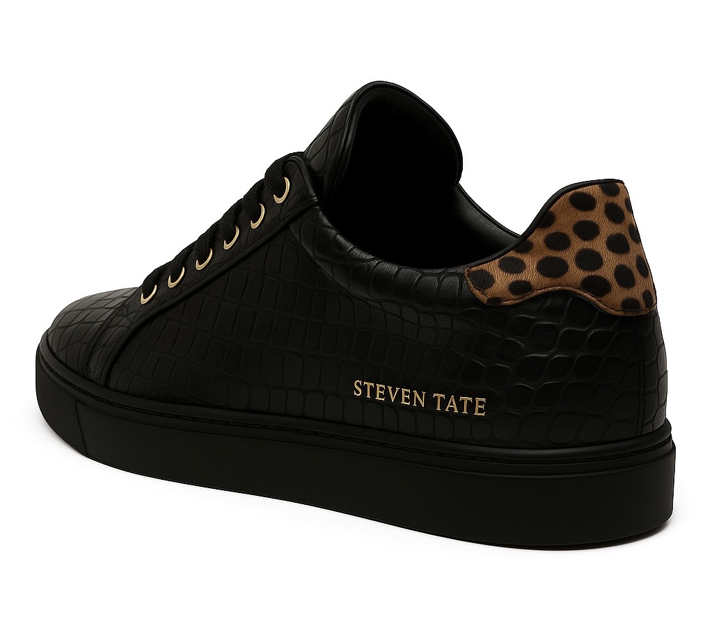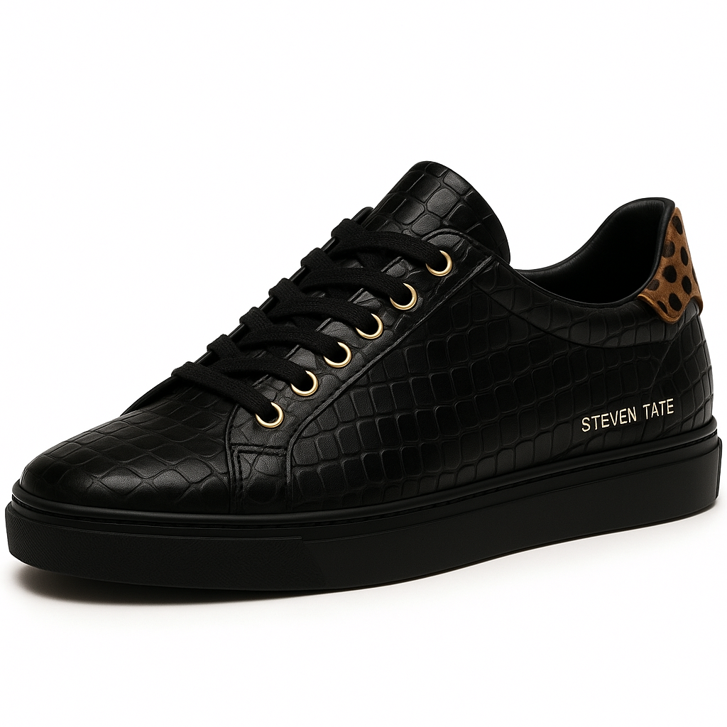 This statement-making low-top sneaker from Steven Tate merges timeless sophistication with a wild luxury twist. Crafted in Italy from black croc-embossed leather, the textured upper brings dimension and richness to a clean silhouette. The golden STEVEN TATE embossing on the lateral side pairs seamlessly with polished gold eyelets, offering a refined yet confident aesthetic.
