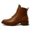 The profile is sleek and structured, with the boot’s crocodile pattern wrapping seamlessly around its body—from the rounded cap toe to the heel. A 7-eyelet lacing system features antique brass hardware and tonal waxed laces, complementing the richness of the brown hue. The enhanced shine across the leather adds a refined gleam, turning every step into a statement.