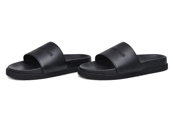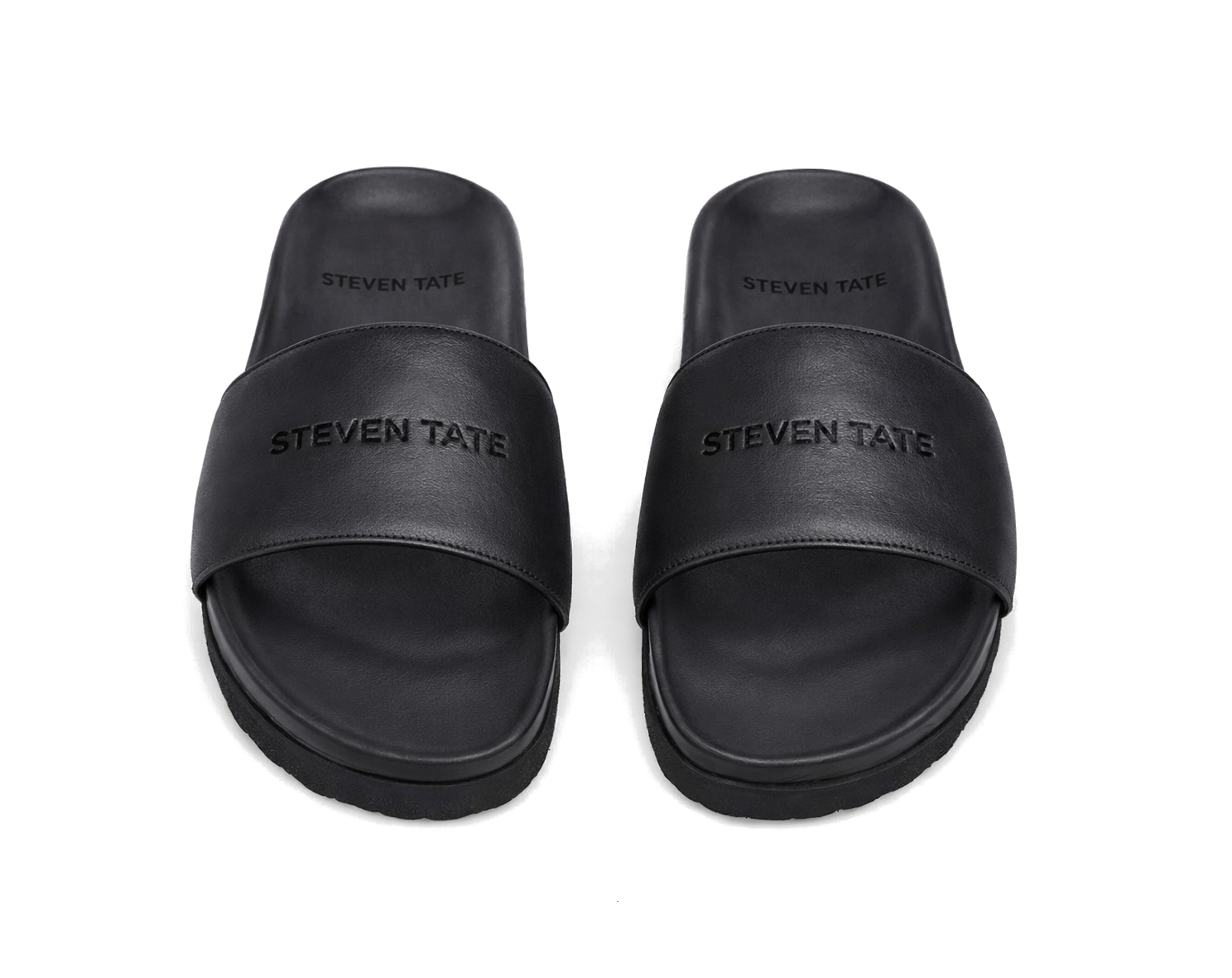 Crafted from premium smooth black leather, the wide strap is softly padded for comfort and embossed with STEVEN TATE in a subtle matte finish for a discreet yet unmistakable signature. The molded footbed is wrapped in smooth black leather for a seamless tonal experience and plush underfoot feel.