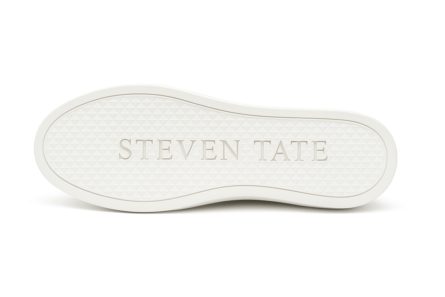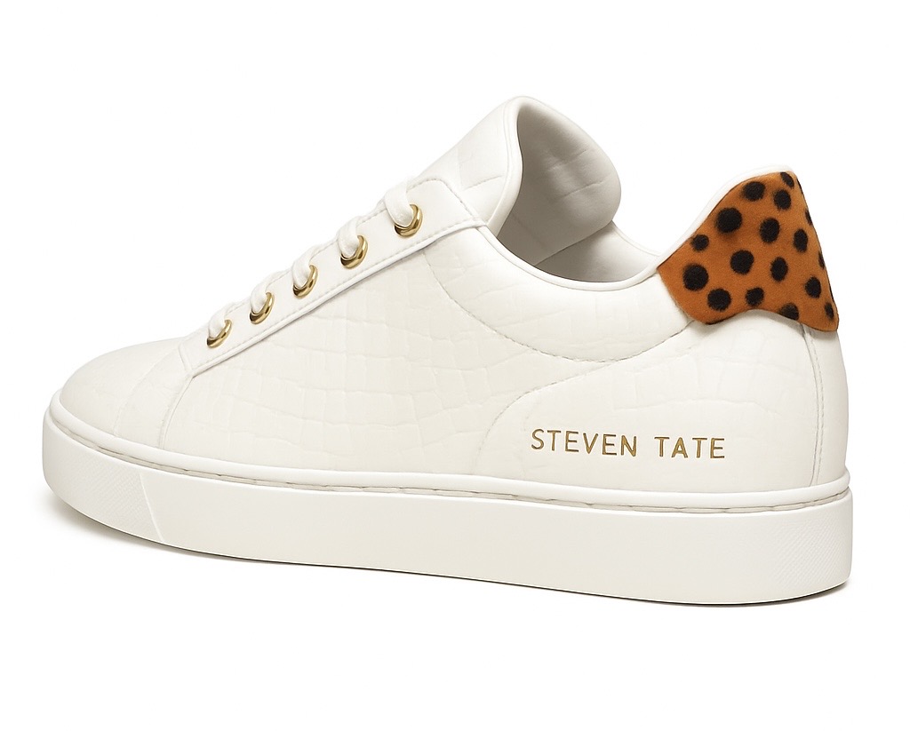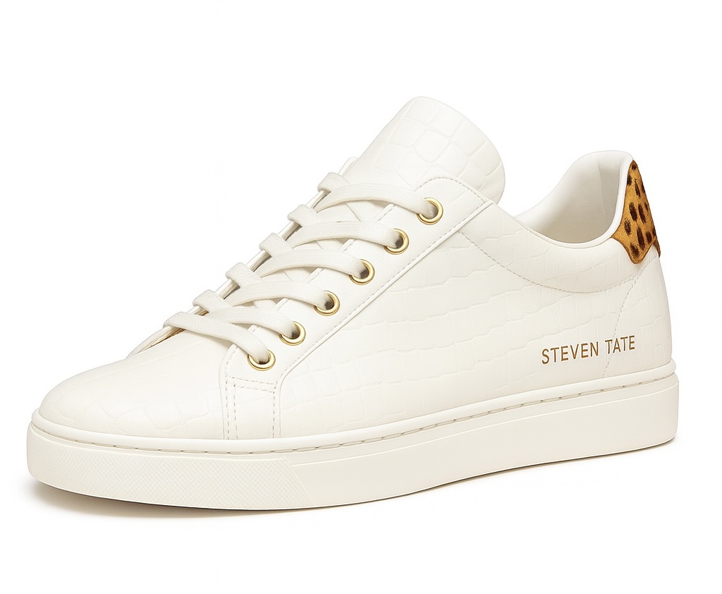 This statement-making low-top sneaker from Steven Tate merges timeless sophistication with a wild luxury twist. Crafted in Italy from white croc-embossed leather, the textured upper brings dimension and richness to a clean silhouette. The golden STEVEN TATE embossing on the lateral side pairs seamlessly with polished gold eyelets, offering a refined yet confident aesthetic.