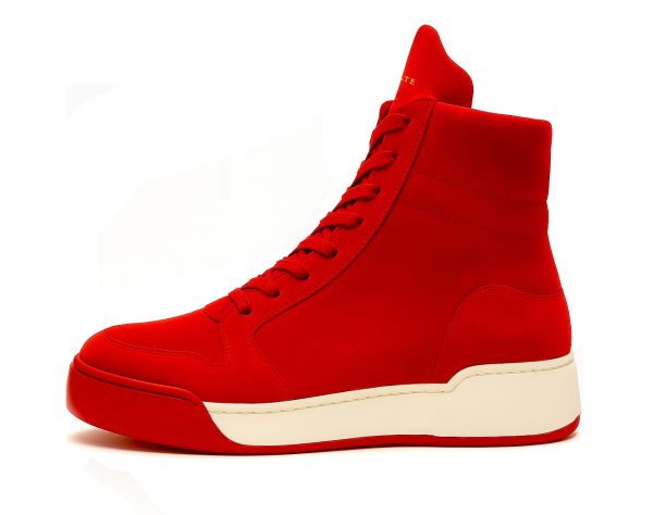 Step into bold sophistication with this vibrant red high-top sneaker, a sleek blend of minimalist design and luxury craftsmanship. The upper is constructed from premium matte leather, expertly cut and stitched for a seamless silhouette that hugs the foot with both structure and comfort. The fiery red tone is consistent across the entire upper, including the laces, tongue, and eyelets, delivering a powerful monochromatic look that commands attention.